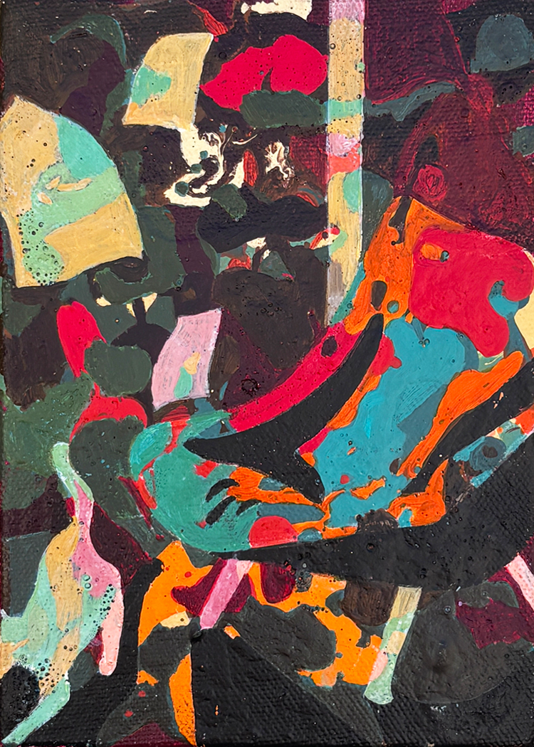 The Mighty Chair (all works, 2025) is architecturally disposed, yet freely so. Winding elements, cat and volumetric spaces are conjoined in an unforced way to maintain a sense of perpetual experiment and exploration, which stimulate inventiveness in relating objects in space. Universally known to induce spatial thought and so a child’s portal into adult worlds, this concrete genealogy is very evident in Prashalee’s paintings devoted to the topic of the studio. Geometric and volumetric figures conjoined in a kind of mental space of creative learning. In the current series of deliberately disparate canvases, The Mighty Chair has all attributes of creative learning through mental alertness. But as cerebral as this may sound, when viewed up close the painting is typical of the artist’s sensitized skill.