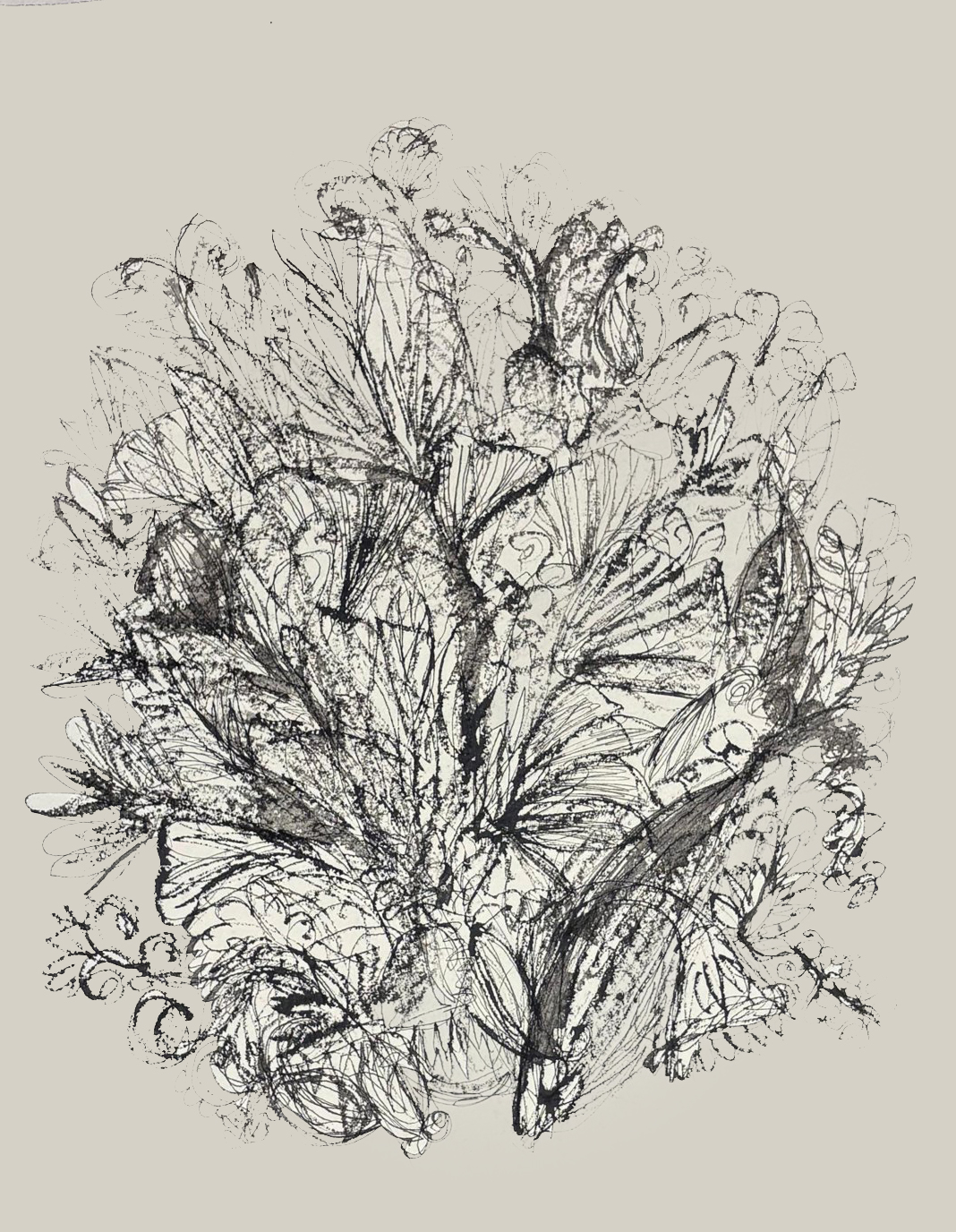 In the last two years of pandemic, artists and writers of all disci- plines have attempted to reimagine their language of expression, realign their though process, and renegotiate their position in the societal structure. Sujata Kar Saha having established her artistic output through abstraction in landscape for several years, have now liberated her sensory manifestations through a fresh spontane- ous series of drawings. Most in pen, ink and pencil, some infused with water colour with pen scratches, these drawings have given shape to Sujata’s burst of impulses through the flora-scape. The in- tricacies noticeable in its line and textures, and the intimacy of its sensory overlaps of hue, create an instinctive rush of creative energy, unmatchable to her prevailing premeditative paintings. This distinct series of drawings, weaves in the reasonable in the vulnerable, the journey in the incertitude, a method in this mad- ness of a pandemic, and the preservation of the fragile temporality. Therefore this series of drawings which has been produced since the last quarter of twenty-twenty and is being titled, PULSES IN IM- PULSE should be observed as the artist’s profound take on her free-spirited creative pulses, manifesting as the counter narrative- for dystopia.
