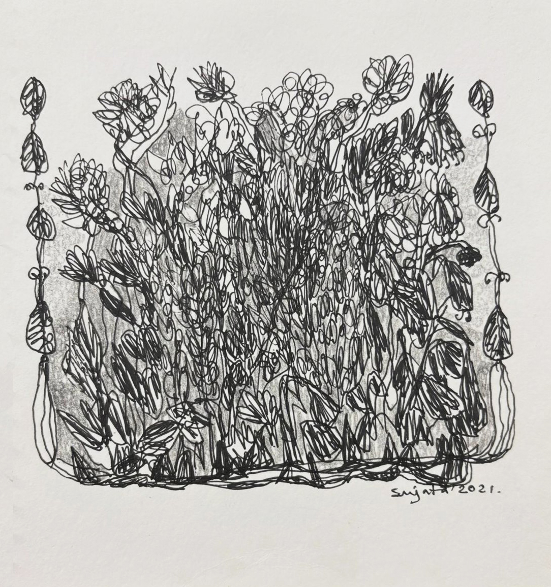 In the last two years of pandemic, artists and writers of all disci- plines have attempted to reimagine their language of expression, realign their though process, and renegotiate their position in the societal structure. Sujata Kar Saha having established her artistic output through abstraction in landscape for several years, have now liberated her sensory manifestations through a fresh spontane- ous series of drawings. Most in pen, ink and pencil, some infused with water colour with pen scratches, these drawings have given shape to Sujata’s burst of impulses through the flora-scape. The in- tricacies noticeable in its line and textures, and the intimacy of its sensory overlaps of hue, create an instinctive rush of creative energy, unmatchable to her prevailing premeditative paintings. This distinct series of drawings, weaves in the reasonable in the vulnerable, the journey in the incertitude, a method in this mad- ness of a pandemic, and the preservation of the fragile temporality. Therefore this series of drawings which has been produced since the last quarter of twenty-twenty and is being titled, PULSES IN IM- PULSE should be observed as the artist’s profound take on her free-spirited creative pulses, manifesting as the counter narrative- for dystopia.