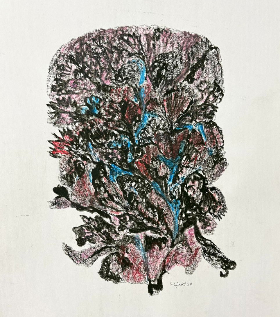 In the last two years of pandemic, artists and writers of all disci- plines have attempted to reimagine their language of expression, realign their though process, and renegotiate their position in the societal structure. Sujata Kar Saha having established her artistic output through abstraction in landscape for several years, have now liberated her sensory manifestations through a fresh spontane- ous series of drawings. Most in pen, ink and pencil, some infused with water colour with pen scratches, these drawings have given shape to Sujata’s burst of impulses through the flora-scape. The in- tricacies noticeable in its line and textures, and the intimacy of its sensory overlaps of hue, create an instinctive rush of creative energy, unmatchable to her prevailing premeditative paintings. This distinct series of drawings, weaves in the reasonable in the vulnerable, the journey in the incertitude, a method in this mad- ness of a pandemic, and the preservation of the fragile temporality. Therefore this series of drawings which has been produced since the last quarter of twenty-twenty and is being titled, PULSES IN IM- PULSE should be observed as the artist’s profound take on her free-spirited creative pulses, manifesting as the counter narrative- for dystopia.