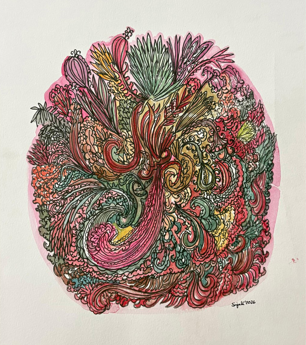 In the last two years of pandemic, artists and writers of all disci- plines have attempted to reimagine their language of expression, realign their though process, and renegotiate their position in the societal structure. Sujata Kar Saha having established her artistic output through abstraction in landscape for several years, have now liberated her sensory manifestations through a fresh spontane- ous series of drawings. Most in pen, ink and pencil, some infused with water colour with pen scratches, these drawings have given shape to Sujata’s burst of impulses through the flora-scape. The in- tricacies noticeable in its line and textures, and the intimacy of its sensory overlaps of hue, create an instinctive rush of creative energy, unmatchable to her prevailing premeditative paintings. This distinct series of drawings, weaves in the reasonable in the vulnerable, the journey in the incertitude, a method in this mad- ness of a pandemic, and the preservation of the fragile temporality. Therefore this series of drawings which has been produced since the last quarter of twenty-twenty and is being titled, PULSES IN IM- PULSE should be observed as the artist’s profound take on her free-spirited creative pulses, manifesting as the counter narrative- for dystopia.