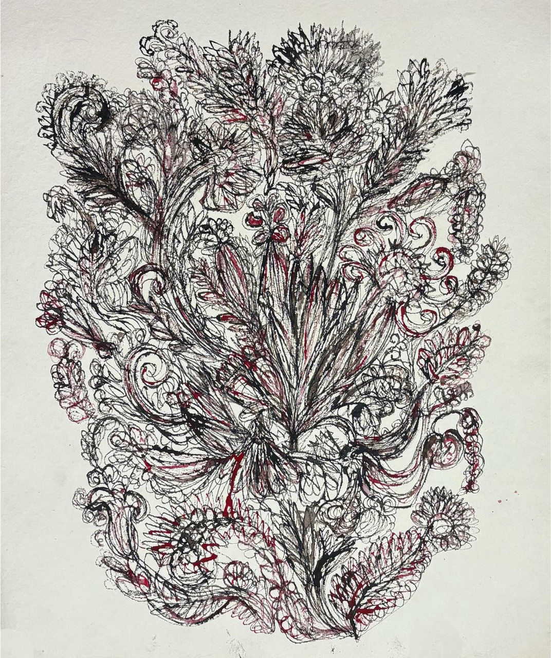 In the last two years of pandemic, artists and writers of all disci- plines have attempted to reimagine their language of expression, realign their though process, and renegotiate their position in the societal structure. Sujata Kar Saha having established her artistic output through abstraction in landscape for several years, have now liberated her sensory manifestations through a fresh spontane- ous series of drawings. Most in pen, ink and pencil, some infused with water colour with pen scratches, these drawings have given shape to Sujata’s burst of impulses through the flora-scape. The in- tricacies noticeable in its line and textures, and the intimacy of its sensory overlaps of hue, create an instinctive rush of creative energy, unmatchable to her prevailing premeditative paintings. This distinct series of drawings, weaves in the reasonable in the vulnerable, the journey in the incertitude, a method in this mad- ness of a pandemic, and the preservation of the fragile temporality. Therefore this series of drawings which has been produced since the last quarter of twenty-twenty and is being titled, PULSES IN IM- PULSE should be observed as the artist’s profound take on her free-spirited creative pulses, manifesting as the counter narrative- for dystopia.